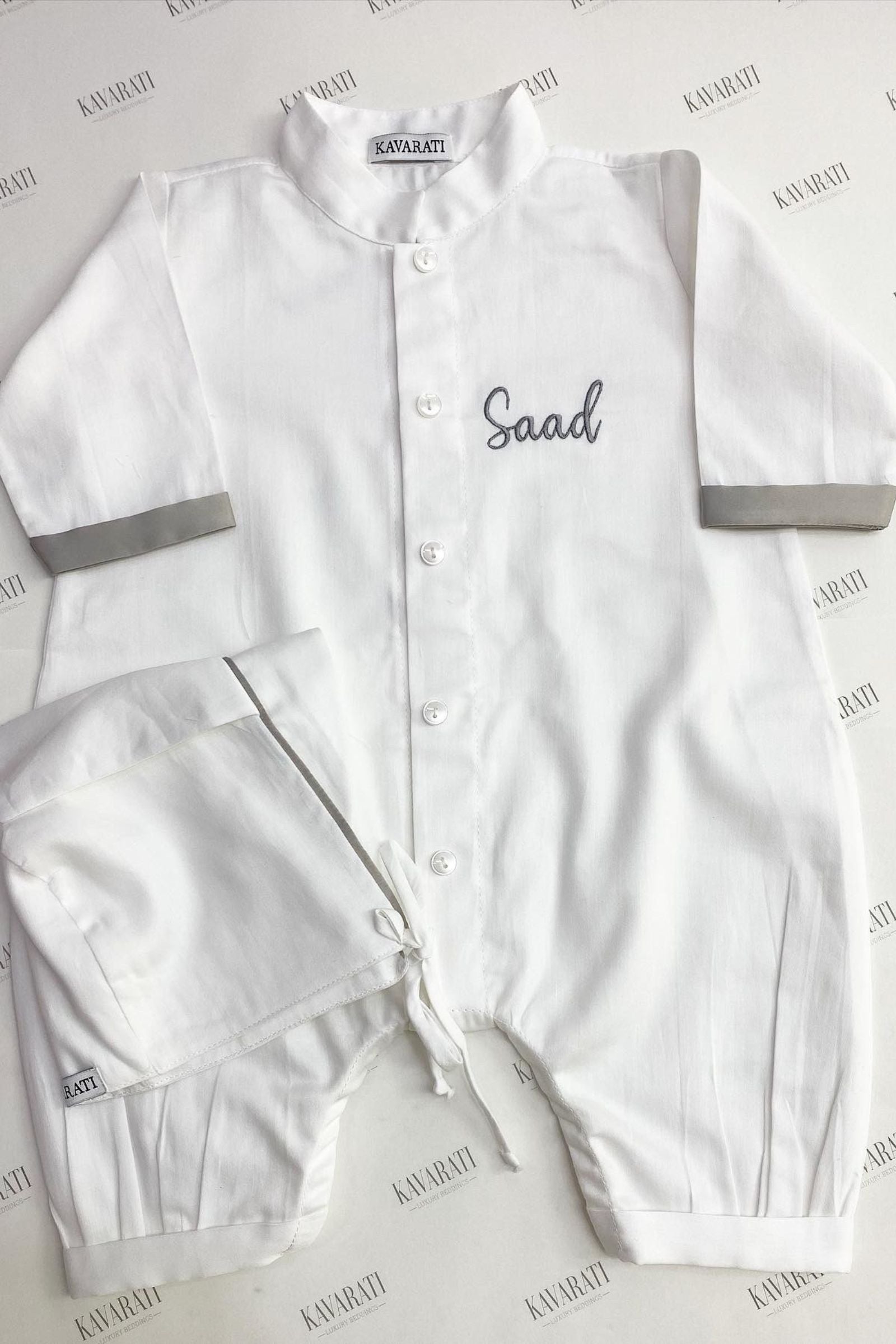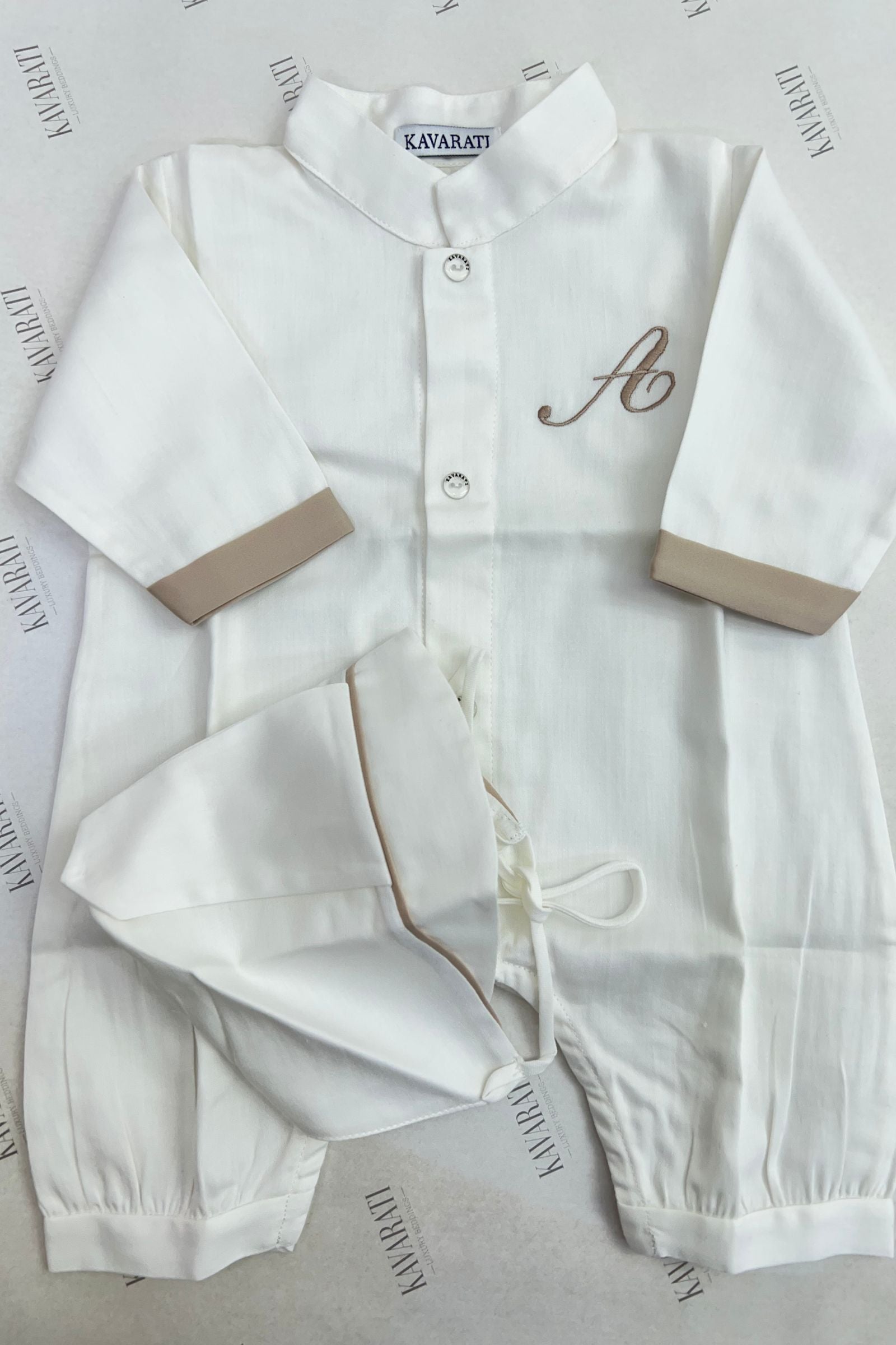 طقم للمواليد مطرز بالإسم قطني مع قبعة مطابقة ناعم ولطيف على بشرة المواليد (المقاس 0–3 أشهر)