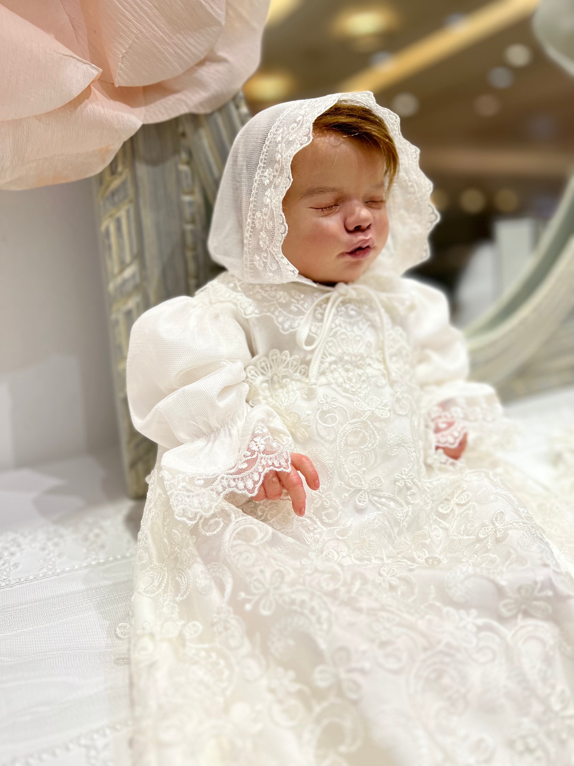 Hand-Embroidered Baby Gown with Bonnet – Elegant Lace Set for Newborns