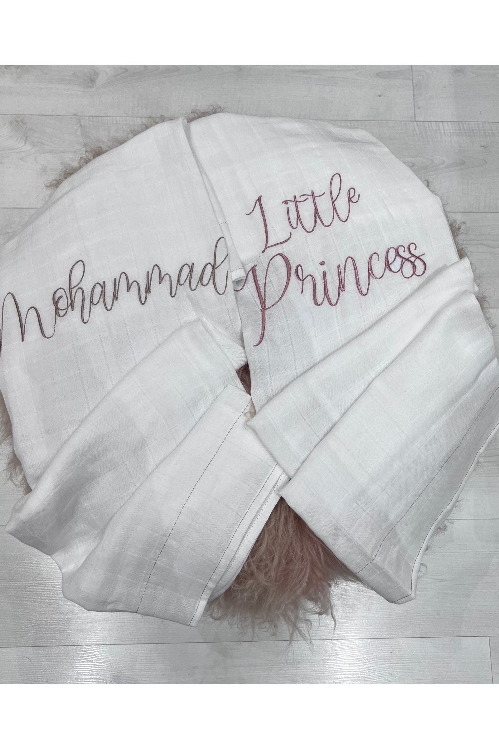 Baby light blanket made from ultra soft premium cotton with an elegant design and personalized name embroidery.