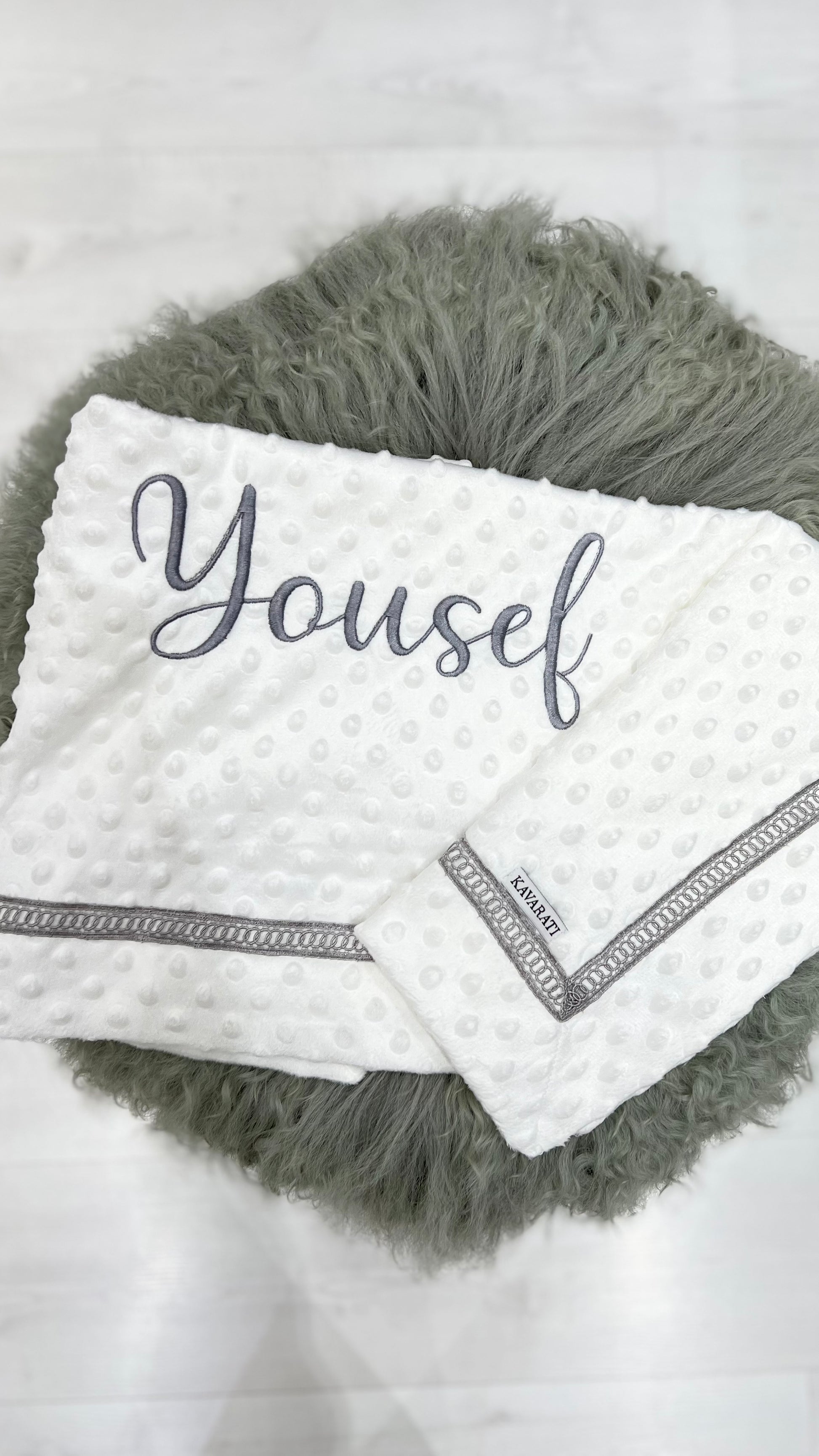 Personalized with embroidered name for a one of a kind keepsake. A blend of warmth, elegance, and everyday practicality.