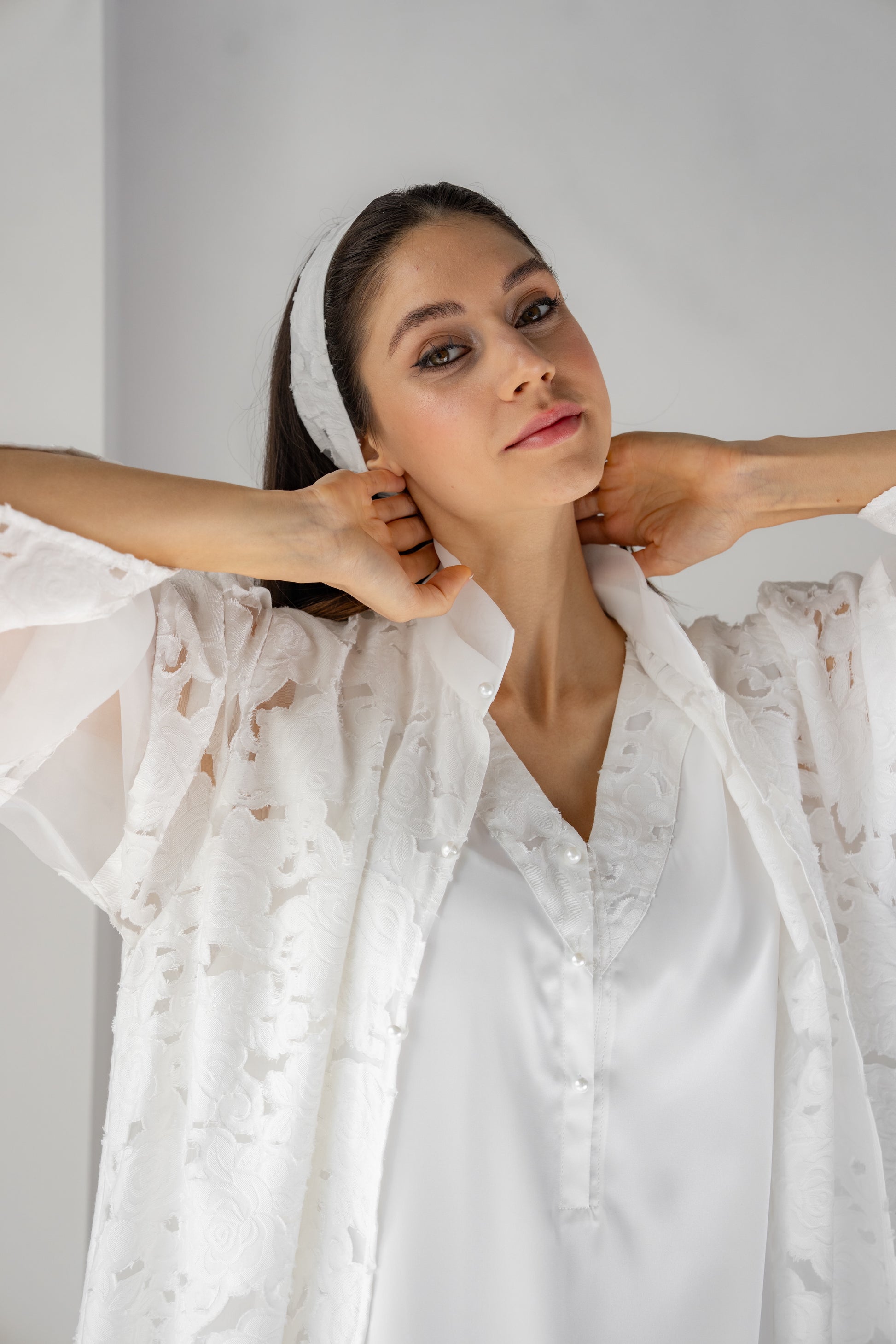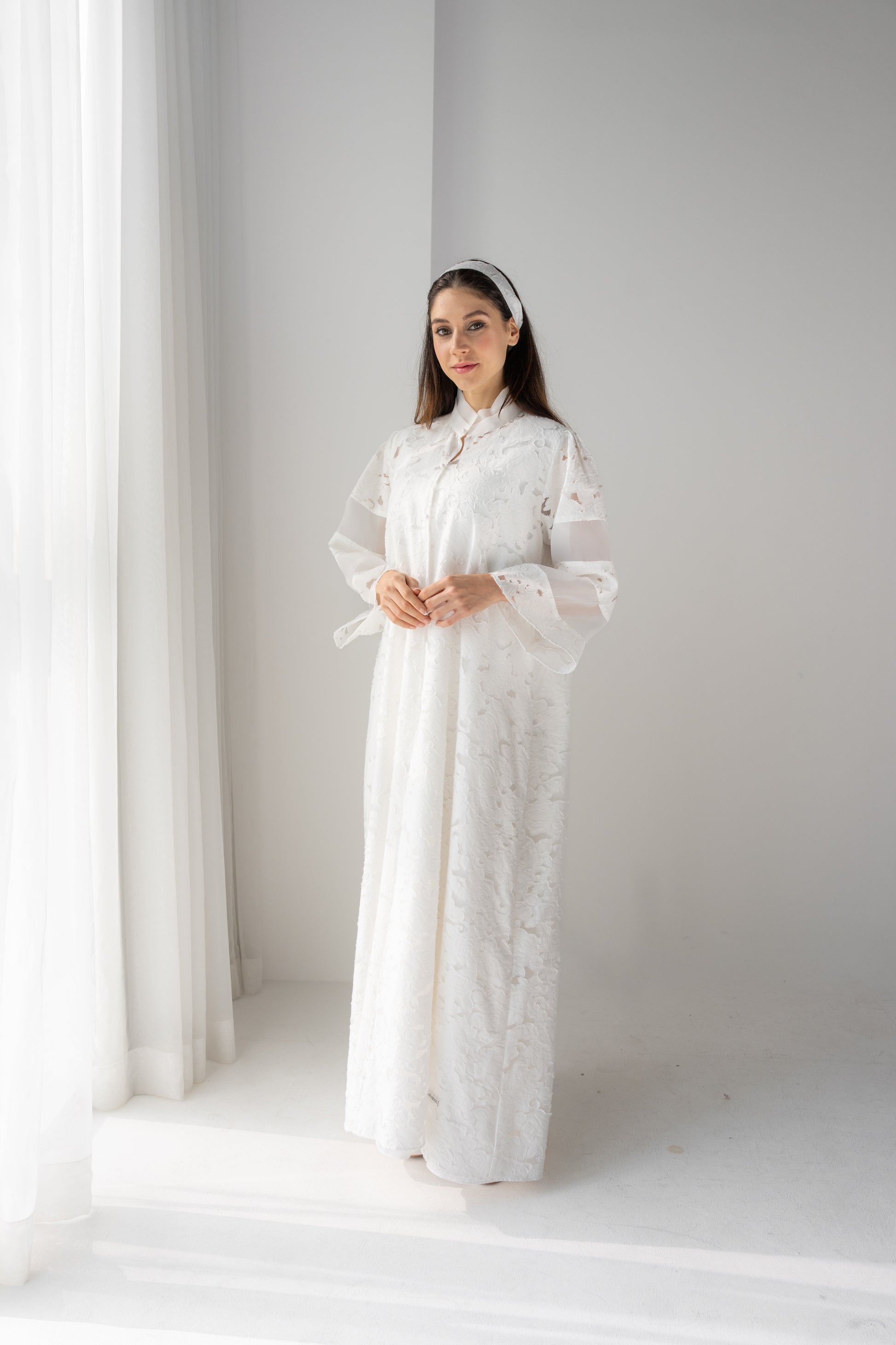 Elevate your maternity experience with this beautifully designed reception set, created to combine elegance, comfort, and practicality. The set features a flowing robe and a nursing friendly dress with a discreet opening, thoughtfully tailored for the modern mother.